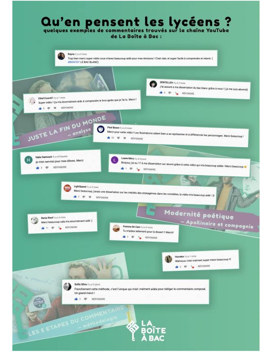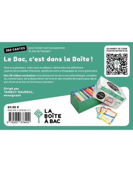 Le Bac, c'est dans la Boîte! 350 cartes pour réviser tout le programme de français en première et en seconde. Seul ou à plusieurs, chez vous ou ailleurs, mémorisez vos définitions, repérez les procédés littéraires, améliorez votre orthographe et votre grammaire grâce à 600 questions et réponses réparties en six catégories. Ce coffret contient également l'accès à 26 vidéos exclusives qui vous offrent une méthodologie complète du commentaire, de la dissertation, de l'oral et des conseils de coachs pour gérer son stress et arriver en forme aux examens! Enfin, faites l'expérience de nos 20 défis littéraires pour apprendre autrement et développer votre imagination! «Placere et docere», plaire et instruire, c'est la mission de la Boîte à Bac et la mission de votre Kit'Bac de français.