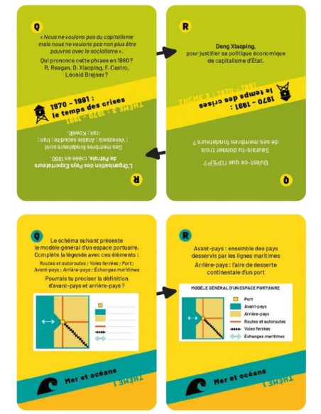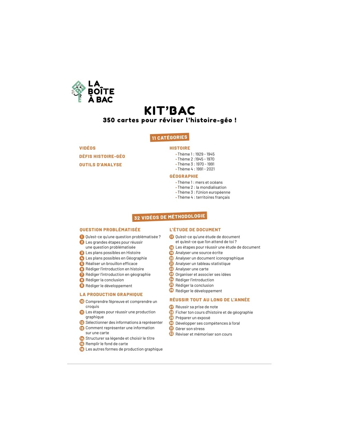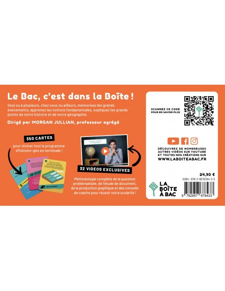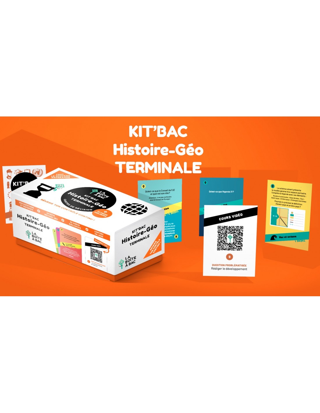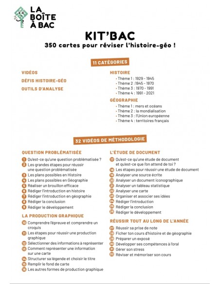 Réussis ton contrôle continu?! 350 cartes pour réviser tout le programme de histoire-géographie en terminale. Seul ou à plusieurs, chez vous ou ailleurs, mémorisez les grands évènements, apprenez les notions fondamentales et découvrez les grands enjeux de notre histoire et de notre géographie grâce à 550 questions et réponses sur l´ensemble de programme. Nos 32 vidéos vous offrent une méthodologie complète de la question problématisée, de l´étude de document, de la production graphique et des conseils de coachs pour réussir sa scolarité?! Enfin, faites l´expérience de nos 29 défis d´histoire-géographie pour jouer, débattre et penser autrement les enjeux de notre monde?! «?Placere et docere?», plaire et instruire, c´est la mission de la Boîte à Bac et la mission de votre Kit´Bac d´histoire-géographie.