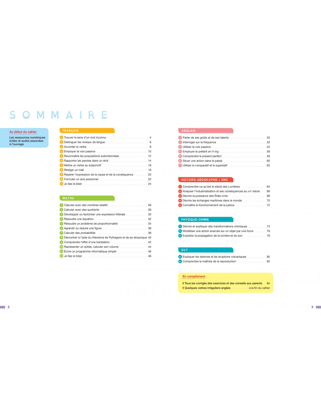 • L’ouvrage regroupe toutes les matières de la 4e : Français, Maths, Anglais, Histoire-géographie EMC, Physique-chimie, SVT.