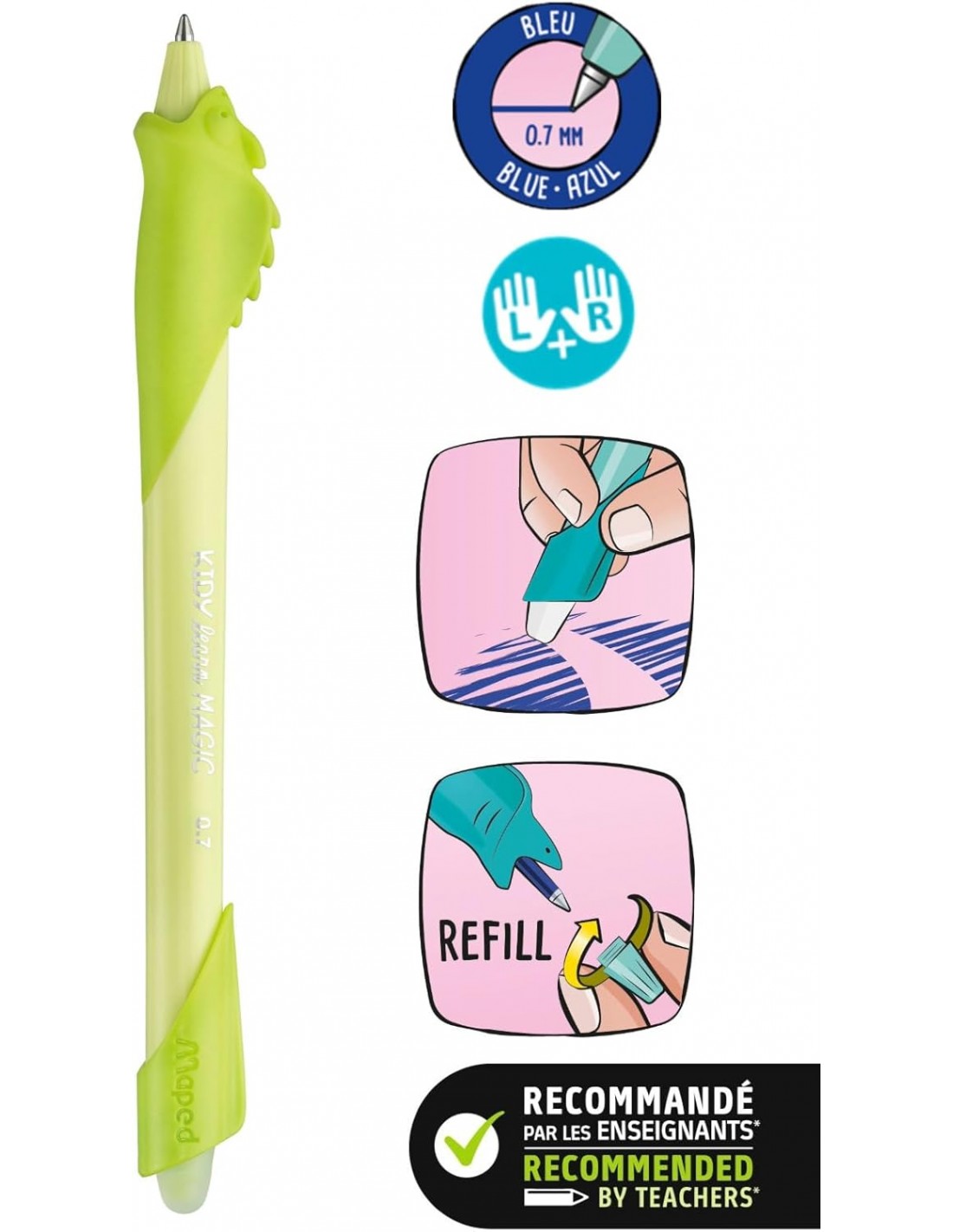 - STYLO EFFAÇABLE : Kidy Learn de Maped est un stylo effaçable mignon avec une zone de préhension confortable en forme de lapin et un système de recharge pratique pour la rentrée scolaire