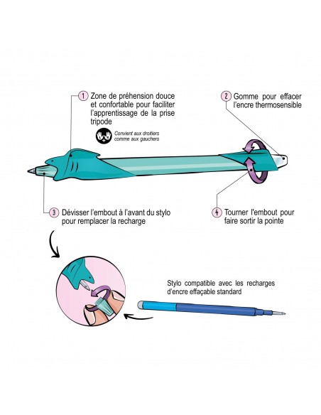 - ASTUCES D’UTILISATION : Dévisser l’embout pour recharger le stylo animaux, utiliser la gomme intégrée pour effacer. Le système rotatif permet de se passer de bouchon, pour éviter les capuchon perdus